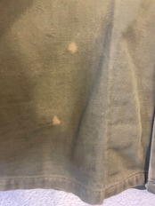 右前身頃の裾あたりと左袖に汚れがございます。